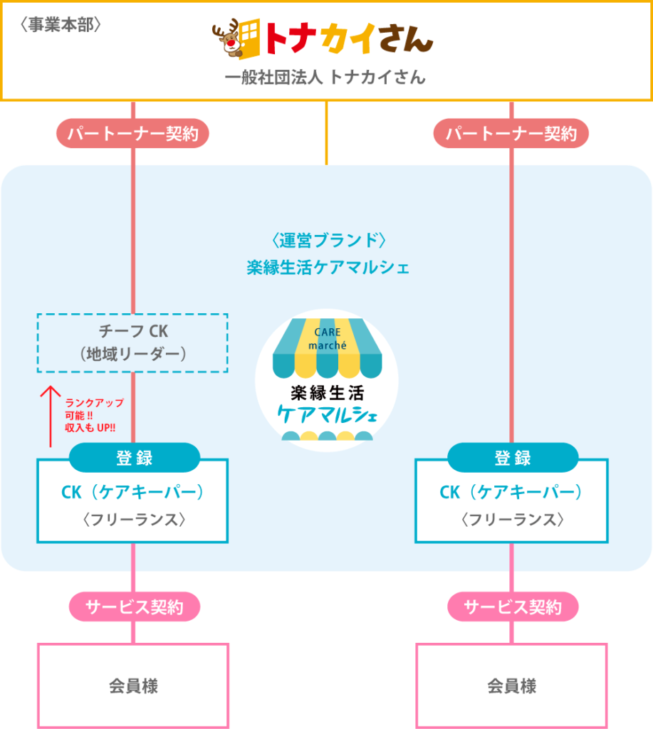 CK(ケアキーパー)さんになるには、「一般社団法人トナカイさん」と契約を結び「楽縁生活ケアマルシェ」のフリーランス(個人事業主)としてパートナー登録をしていただきます。